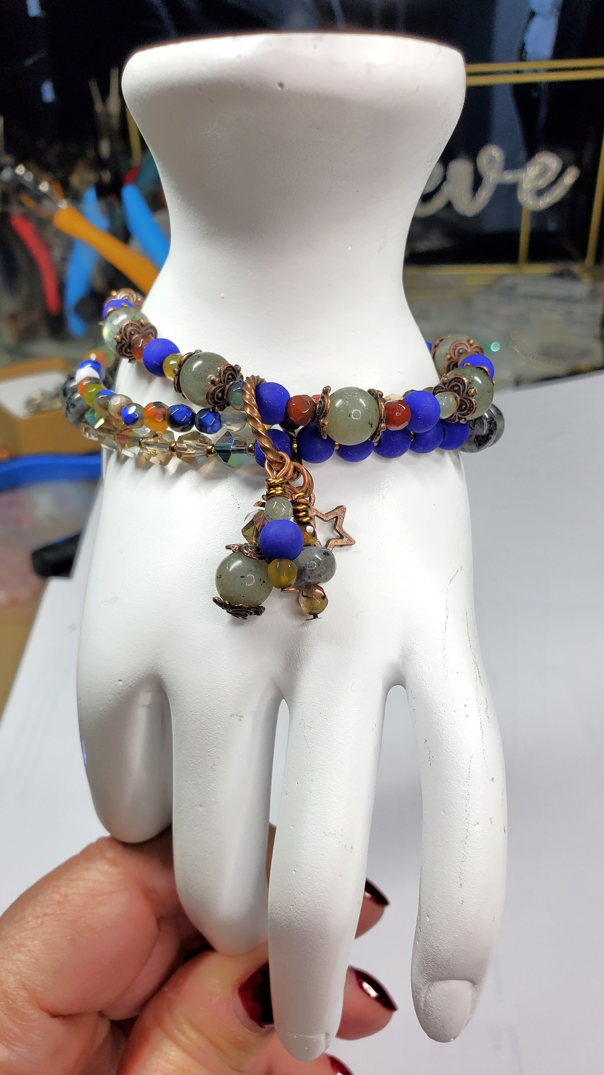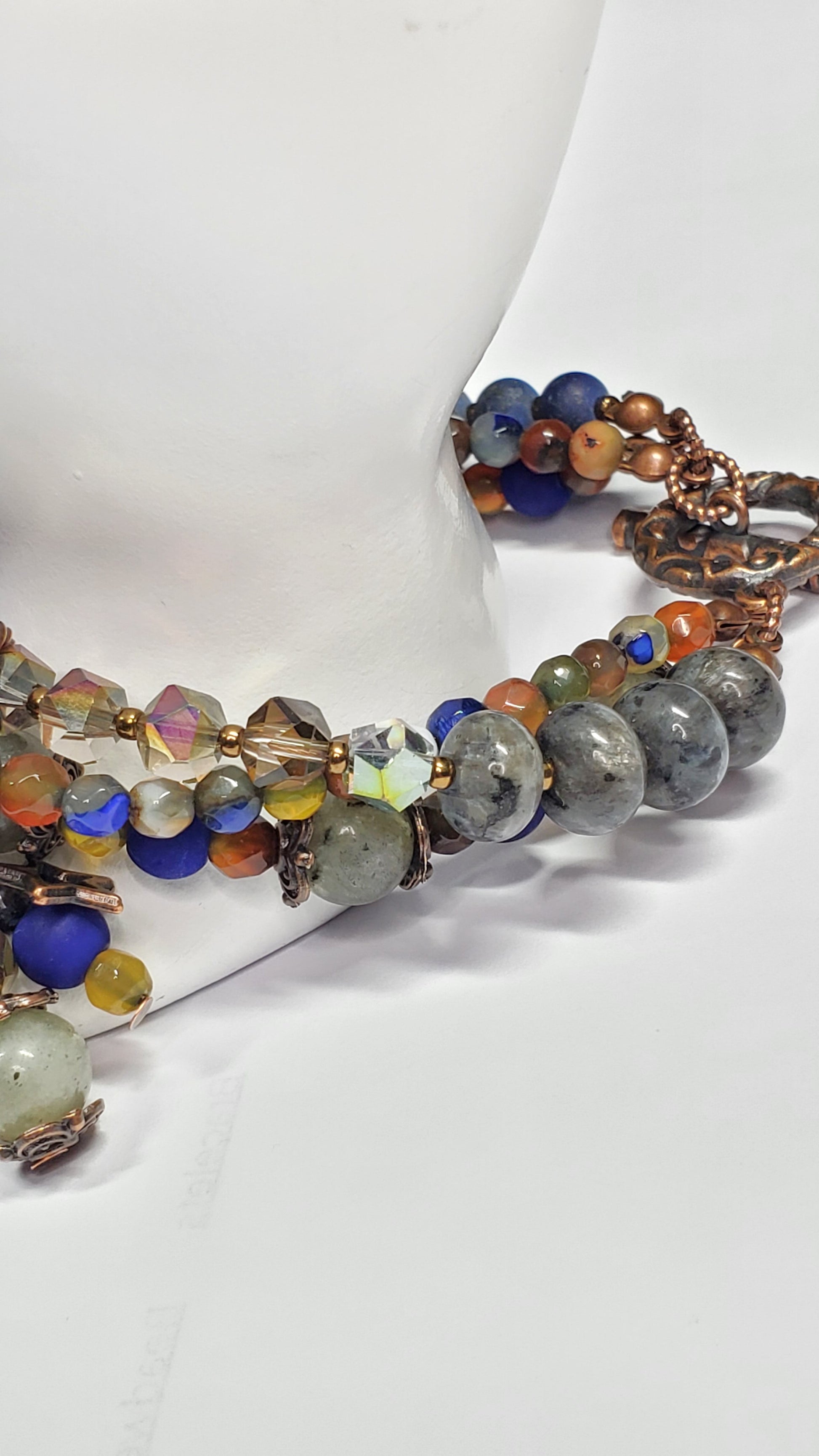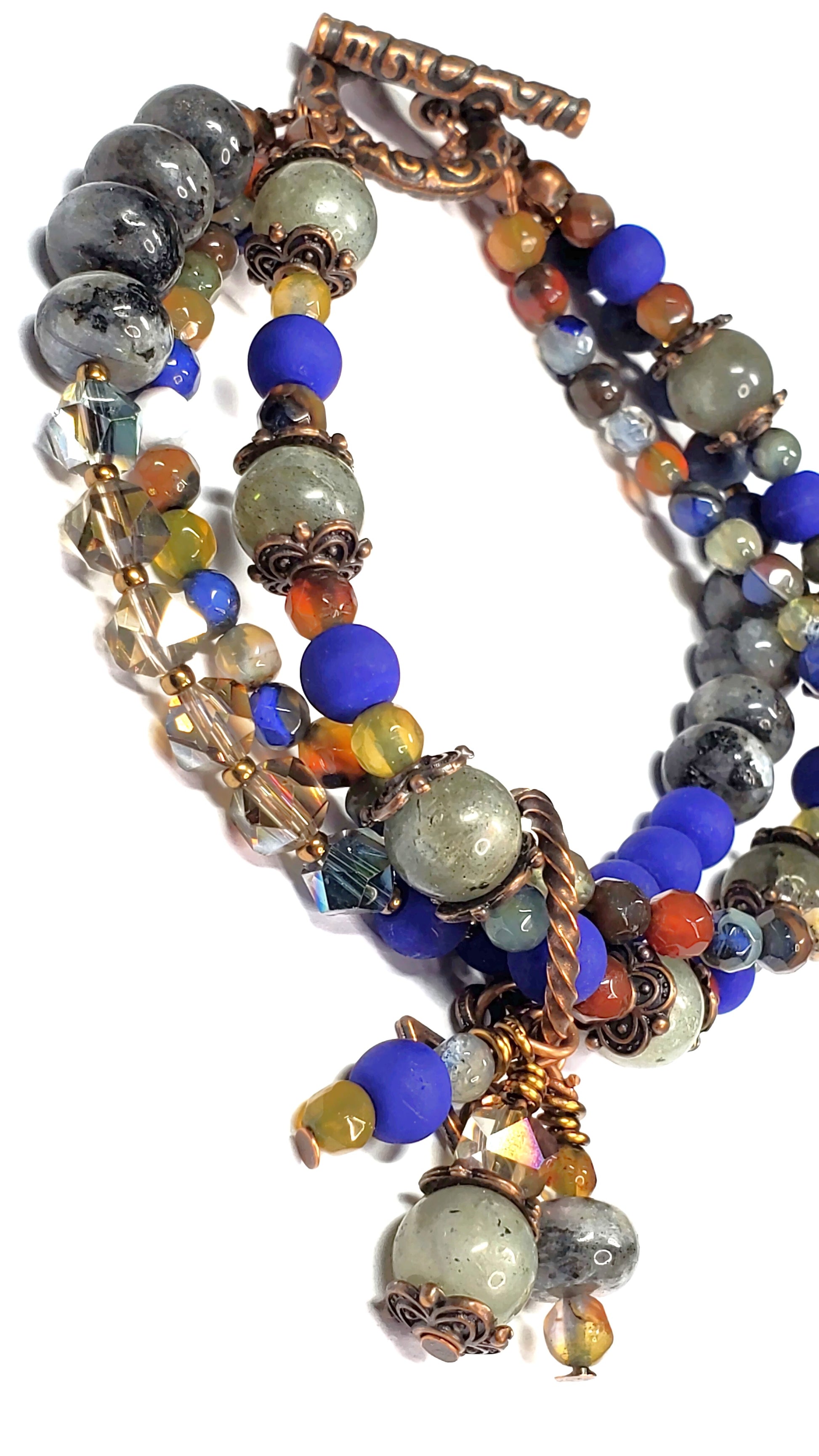 Each layer features a unique combination of Labradorite beads, faceted crystals, matte and polished accent stones, and decorative charms, all woven securely on high-quality wire. The soft gray flashes of Labradorite pair beautifully with glowing crystal beads, warm bronze findings, and rich blue and multicolor accents—creating a multidimensional, eye-catching design.