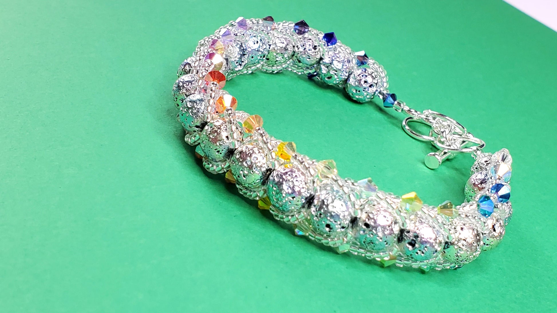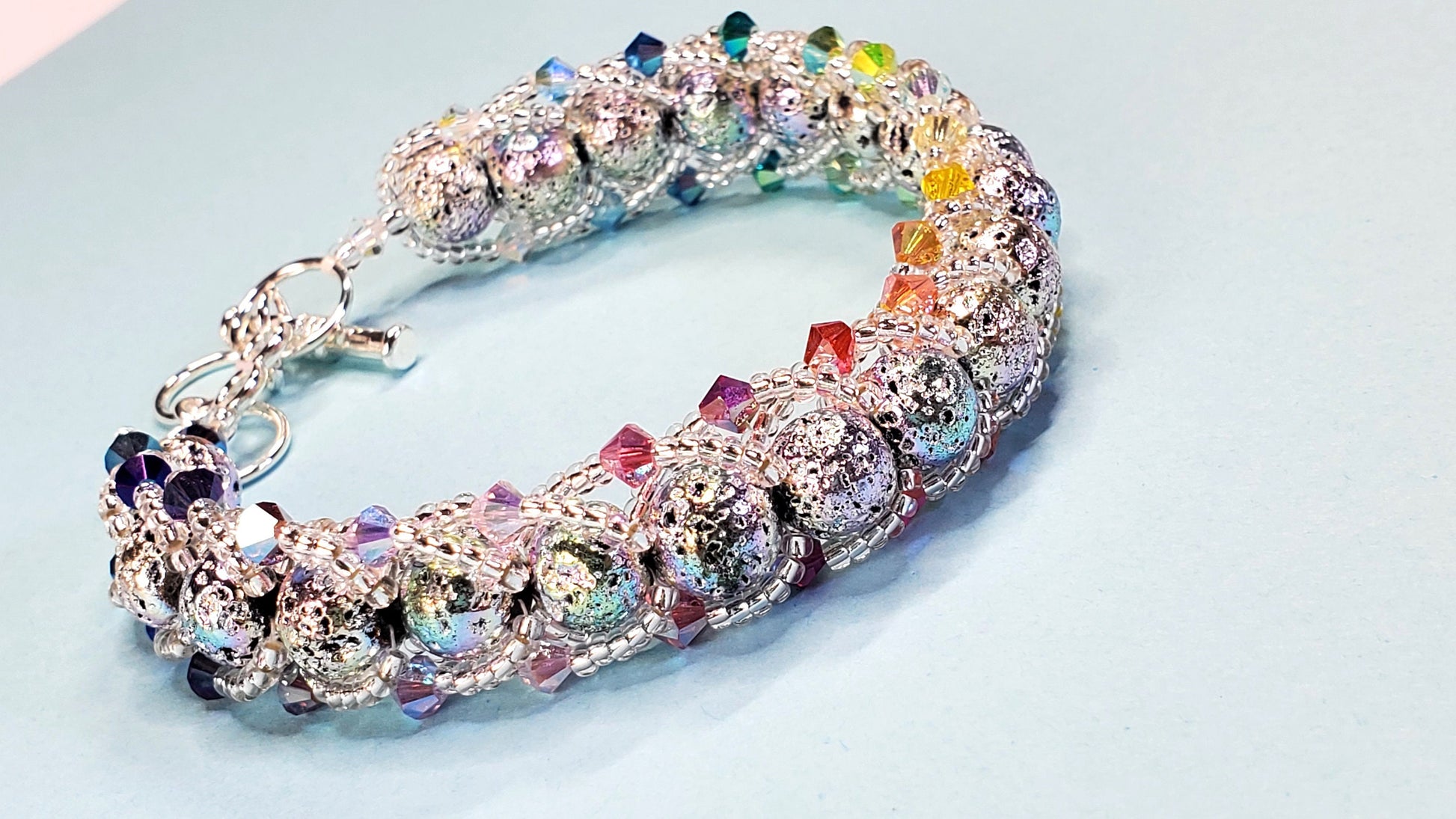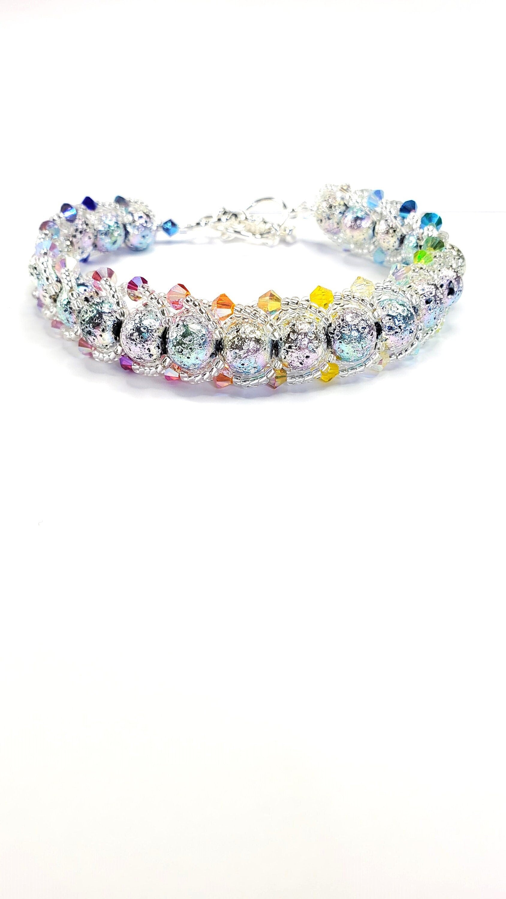 The bracelet features a combination of colorful rainbow crystals and lava beads, creating a beautiful and eye-catching design. The crystals and glass beads are carefully arranged to create a mesmerizing pattern, while the pearls add a touch of sophistication.