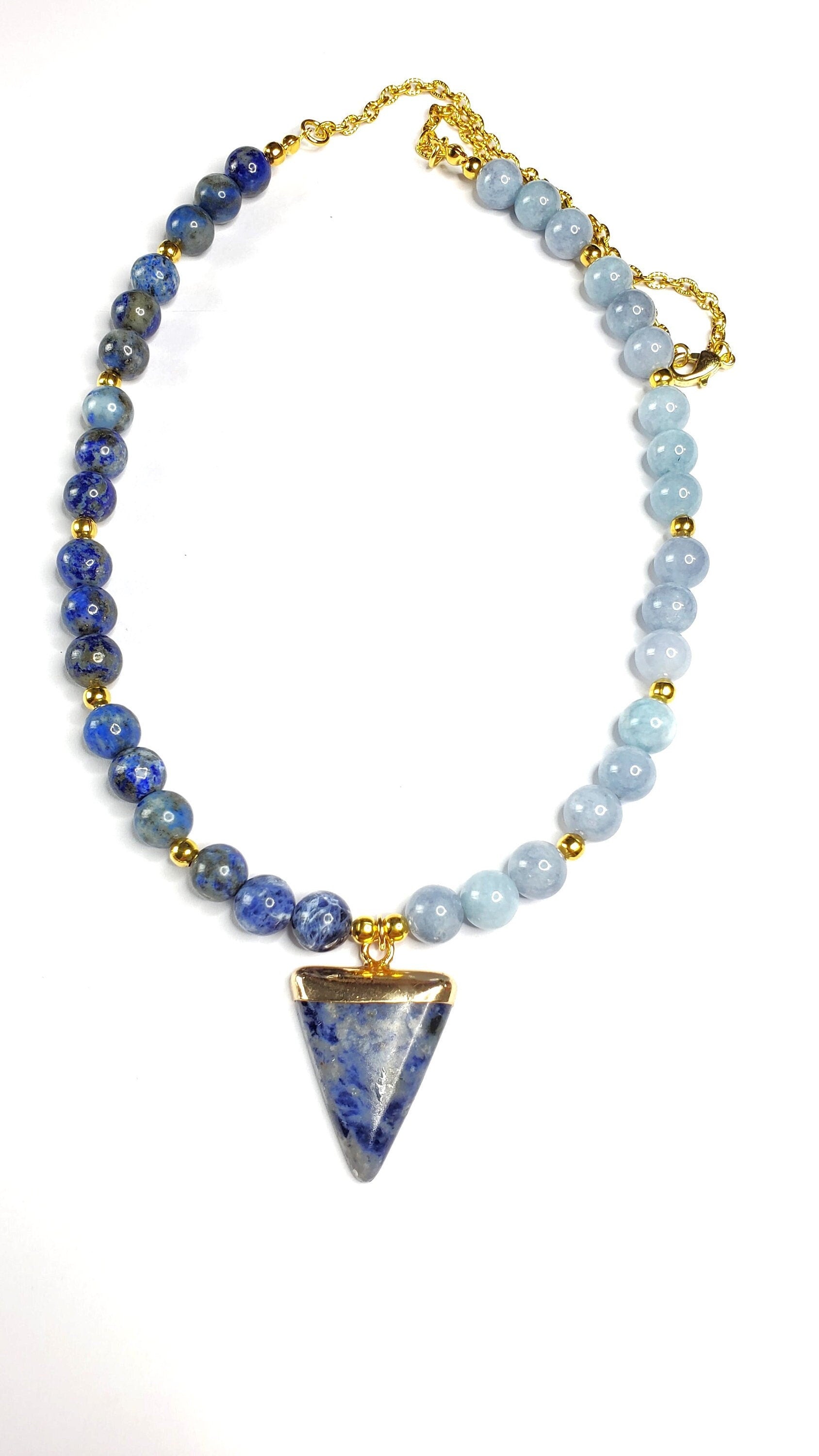 Blue & Gold Gemstone Necklace with Agate, along with a Sodalite and Brass Pendant